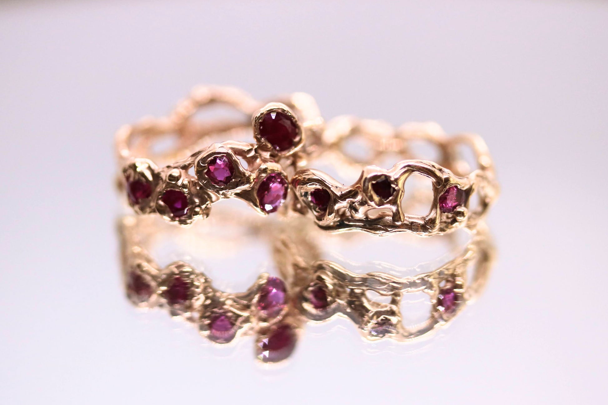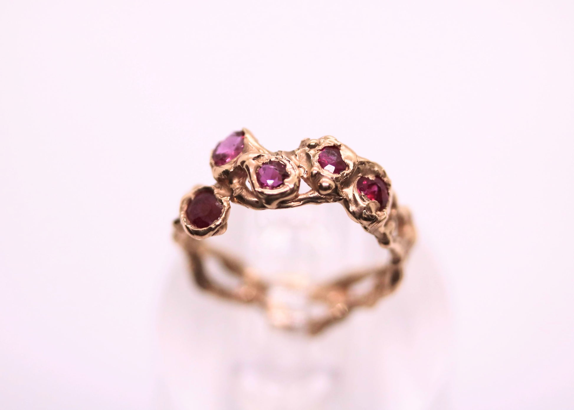 Indulge in luxury with our Five Ruby Jukai Gold Ring. Each ring is one of a kind, handcrafted with a timeless elegance. The organic shape and stacking design add a unique touch, while the rich ruby stones bring sophistication to your style. Treat yourself to something truly special.
