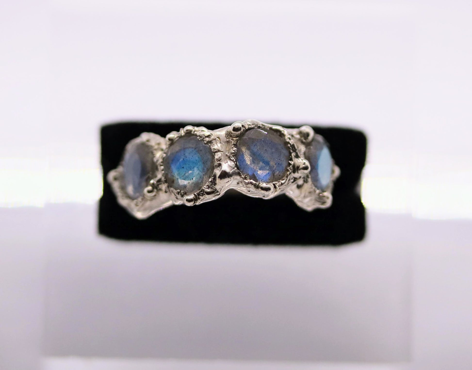 ブルーフラッシュの美しいラブラドライトを4石使い、オーガニックなままの美しさをメインにしたハーフエタニティのリングです。一点ものです。